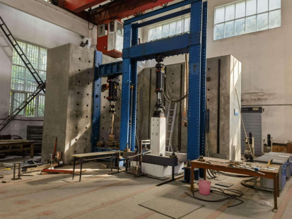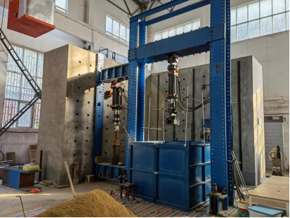 MTS电液式伺服试验系统包括大型液压泵站、4个作动器及专用竖向加载设备、反力架、冷凝塔、L形反力墙、槽式刚性台座等配套设备,可对结构进行三维加载,单作动器最大推力为1000KN,可力和位移双控,可按输入波形加载。