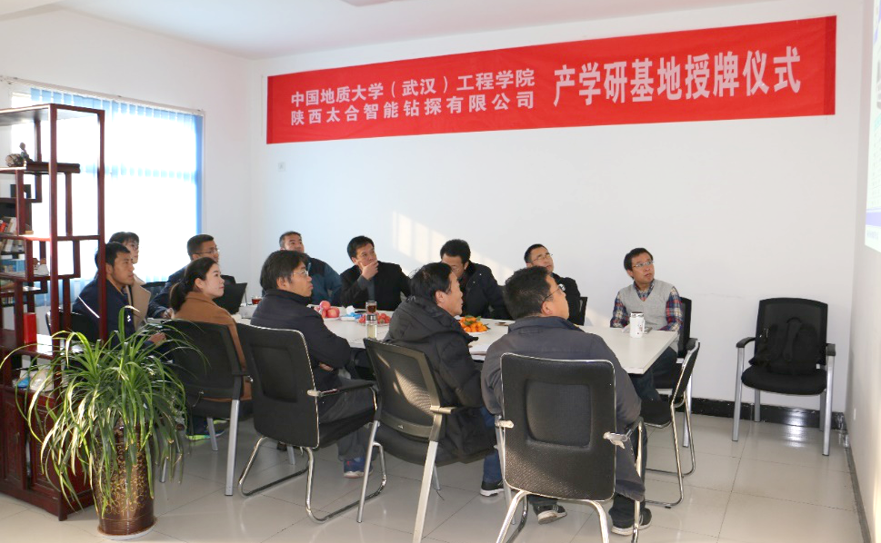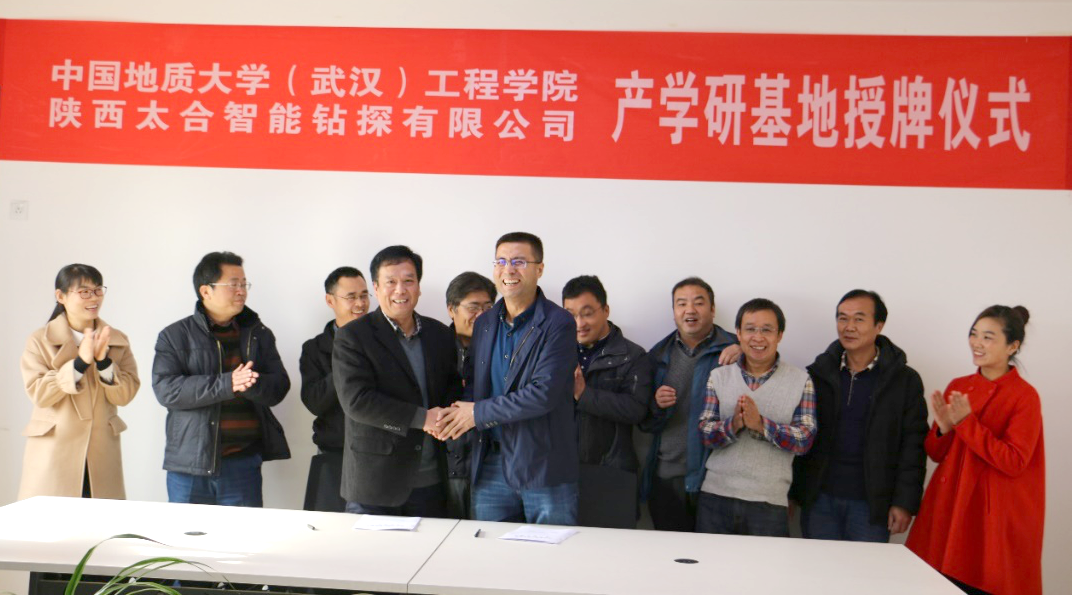 中国地质大学星空在线手机版(大中国区)党委书记陈飞、副院长窦斌以及勘查与基础工程系段隆臣书记、胡郁乐教授、陕西太合智能钻探有限公司董事长王义红、钻探工艺部部长石明善、机械研发部技术总监薛向宇、生产工艺部部长彭腊梅、仪器研发部部长杨英男和液压总工程师邓代传等十余人出席此次签约仪式。
