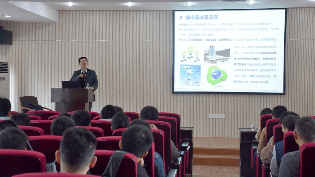 报告围绕“城市更新中绿色施工技术探索与实践”展开,介绍了上海建工集团工程研究总院在复杂的城市环境中绿色施工技术的探索和工程实践经验,分别从“高架桥梁预制拼装技术”、“地下结构预制拼装技术”和“渣土再生利用技术”三个方面介绍了绿色施工技术中的关键技术问题和积累的工程经验。报告结束后,吴小建所长热情回答了参会师生的提问,他衷心希望我院师生在城市绿色施工技术上取得更大的突破,为解决我国城市施工中的环境难题做出贡献。