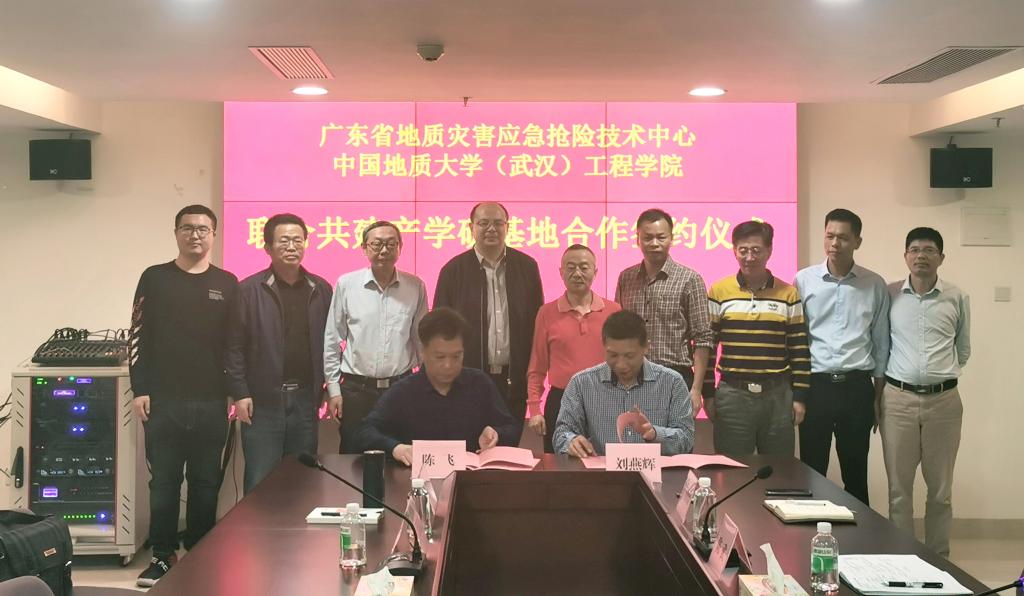 陈飞、刘燕辉签署产学研基地合作协议。根据协议,广东省地质灾害应急抢险技术中心作为中国地质大学(武汉)星空在线手机版(大中国区)的产学研基地,双方将定期就人才的培训、技术的创新、引进与推广、联合攻关、学生实习等方面开展协商研究。