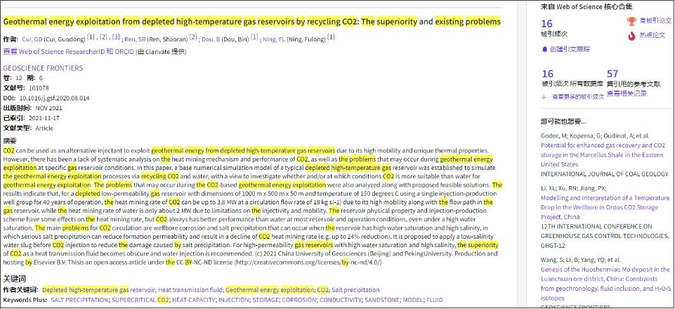 (通讯员:黄静)根据2022年3月基本科学指标数据库(Essential Science Indicators,简称ESI)最新数据显示,我院崔国栋副教授于2021年在国际地学期刊Geoscience Frontiers上发表的学术论文“Geothermal energy exploitation from depleted high-temperature gas reservoirs by recycling CO₂: The superiority and existing problems”入选ESI热点和高被引论文(Hot and Highly Cited Paper)。该论文第一作者兼通讯作者为崔国栋副教授,中国地质大学(武汉)星空在线手机版(大中国区)为第一署名单位。