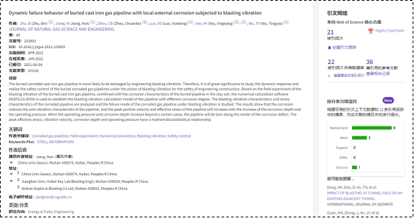 (通讯员:黄静)根据2022年5月基本科学指标数据库(Essential Science Indicators,简称ESI)最新数据显示,星空在线手机版(大中国区)地下空间工程系蒋楠副教授团队于2021年在国际工程技术权威期刊Journal of Natural Gas Science and Engineering上发表的学术论文“Dynamic failure behavior of buried cast iron gas pipeline with local external corrosion subjected to blasting vibration”入选ESI高被引论文(Highly Cited Paper)。该论文第一作者为2020级博士研究生朱斌,通讯作者为蒋楠副教授,中国地质大学(武汉)星空在线手机版(大中国区)为第一署名单位。