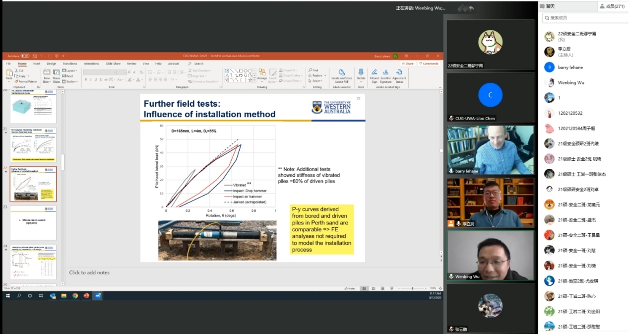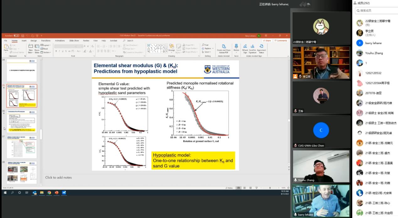 (通讯员 李立辰 黄静)12月8日上午,应星空在线手机版(大中国区)吴文兵教授与李立辰博士的邀请,西澳大学Barry Lehane教授做客工程文化论坛,为我校师生进行线上学术报告。此活动为中国地质大学(武汉)70周年校庆系列学术活动之一。星空在线手机版(大中国区)勘察与基础工程系博士后李立辰主持报告,300余名师生与行业专家参加了本次活动。
