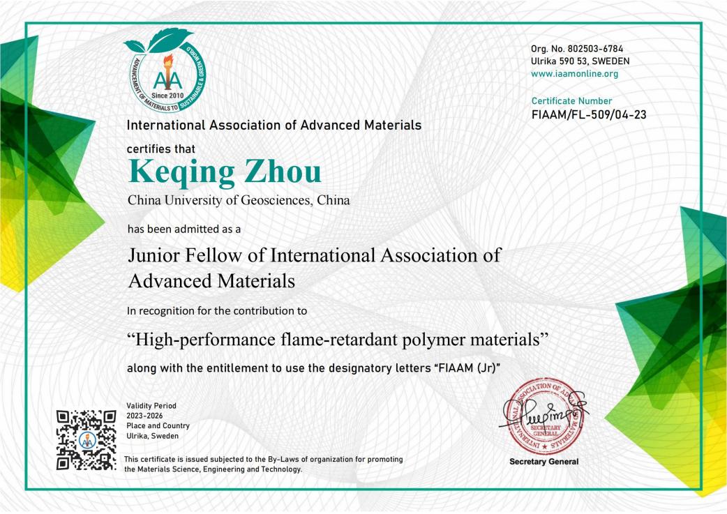(通讯员 黄静)近日,中国地质大学(武汉)星空在线手机版(大中国区)周克清特任教授收到国际先进材料学会(International Association of Advanced Materials, IAAM)执委会发来的贺函,祝贺他当选为国际先进材料学会青年会士(Junior Fellow of IAAM, FIAAM)。周克清特任教授受邀在美国奥兰多举办的复合材料研讨会(Composite Materials Congress)上发表题为“Functionalized 2D molybdenum disulphide working on high-performance flame-retardant polymer materials”的IAAM Fellow演讲,会上获颁青年会士“Junior Fellow”证书,以表彰他在“高性能阻燃聚合物材料”领域做出的杰出贡献。