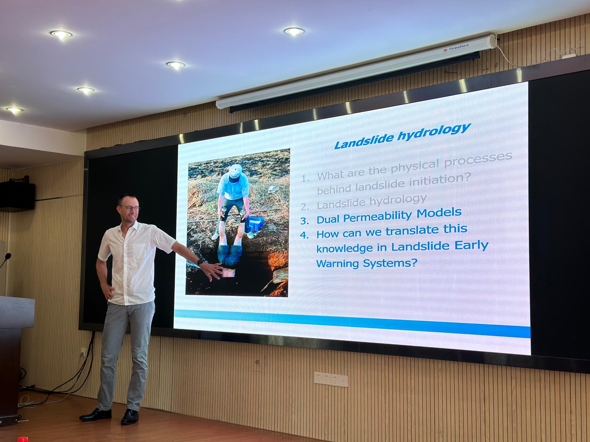Thom Bogaard教授做了题为 “Landslide hydrology: from hydrology to pore water pressureand landslide initiation” 的精彩报告。报告基于微观层面上的水、应力和变形之间的动态相互作用与宏观层面上的斜坡和流域非线性排放过程进行展开,生动明了地诠释了滑坡水文学的研究背景、研究内容以及研究前景。Thom Bogaard教授详细地介绍了山体滑坡的主要诱因,进一步引申出滑坡水文学这一跨学科课题。报告指出该课题需要将水文计算与地质学、地貌学、水力学和水文学等相关领域的理论有机结合起来。之后,Thom Bogaard教授围绕着何为“滑坡集水区”、基岩的水文作用、土壤内部的动力三个问题展开讨论,揭示了水的“填充、储存和排水”对于理解和量化滑坡行为的重要性。同时指出在充分考虑边坡稳定性的基础上,合理设置动态边界条件是开发滑坡水文模型的关键。最后,报告针对如何将水文过程与触发机制的物理过程相匹配进行了展望。