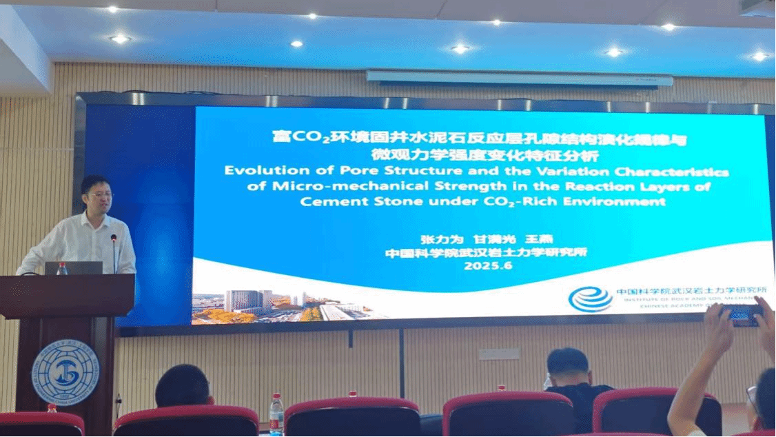 张力为研究员以“富CO2环境固井水泥石反应层孔隙结构演化规律与微观力学强度变化特征分析”为题,介绍了CO2地质封存及油气开发过程中,CO2对固井水泥的长期化学腐蚀以及力学性能劣化,并分享了现阶段研究工作。其团队结合纳米CT与SEM-EDS,揭示了高浓度CO2对固井水泥的腐蚀机理;发现水泥内部经过CO2腐蚀后,会形成石膏会并抑制水泥内部腐蚀破坏。进一步研究表明,遭受CO2腐蚀的水泥石外部腐蚀区微观力学性能最差、致密碳化层最佳,反应层则呈现周期性演化特征。研究获得的弹性模量和硬度数据可为井筒微观化学腐蚀-宏观力学强度演变耦合模型的参数取值提供依据。