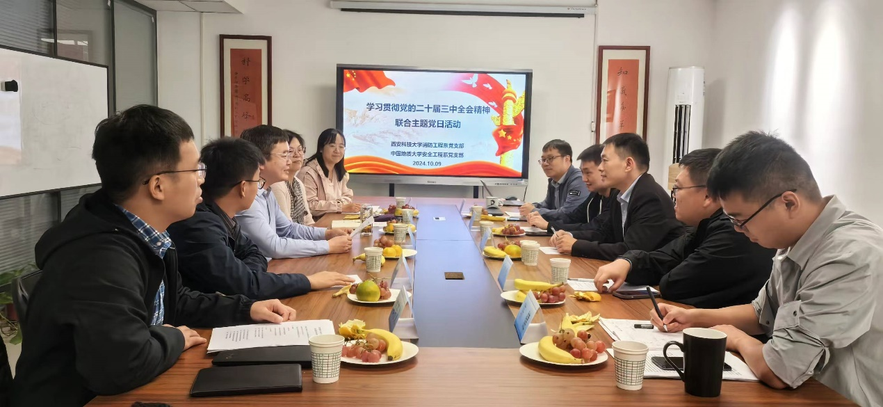(通讯员 周克清、王涌宇)为深入贯彻落实党的二十届三中全会精神,坚定理想信念,强化交流合作,积极投身立德树人和科研攻关创新,10月9日上午,星空在线手机版(大中国区)安全工程系党支部书记周克清、支部党员陆凯华、王涌宇前往西安科技大学,与安全学院消防工程系党支部联合开展“学习贯彻党的二十届三中全会精神”主题党日活动。西安科技大学安全学院副院长兼消防工程系党支部书记马砺教授、系主任张嬿妮教授、党支部副书记盛友杰、组织委员王翠霞、纪检委员郭芳义等党员代表参加活动。